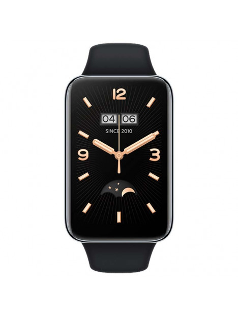 La Xiaomi Smart Band 7 Pro combina un marco de metal brillante con una carcasa trasera y una correa de silicona mate, todos de color negro. Así pues, la Band 7 Pro reluce con un aspecto elegante muy liviano y suave al tacto.